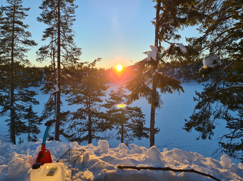Lørdag var det nydelig sol og skikkelig winter wonderland. Skiløypene bugnet av skifolk, men vi tok det helt med ro. Vi gravde en liten grop som vi la reindyrskinnene nedi og satt der og nøyt livet. Litt utpå ettermiddagen spente vi på oss trugene og tuslet bort til bilen for å hente mer ved. Jammen glad vi hadde med det i og med at det ble så kaldt. Lørdag kveld var det ikke like kaldt, kun -14. Man blir rimelig sigen av så mye frisk luft, så vi holdt ikke ut så veldig sent denne kvelden. Vi sov faktisk godt begge to og heller ikke denne natten var noen av oss kalde. Vi våknet nok en gang til strålende sol på søndag morgen og lyden av de mange skientusiaster på tur.