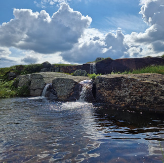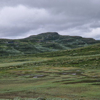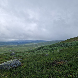 Dag 3 våknet vi til et langt mindre koselig vær! Det regnet, tåken hang nedover fjellsidene og sikten var dårlig. Det var bare å kle seg opp i full regnhabitt. Heldigvis regnet det ikke så mye da vi gikk, så det var ikke så ille. Pga værmeldingen og det at vi begynte å skjønne omfanget av teltproblemene, bestemte vi oss for å gjøre om på planlagt rute. Vi ville nødig gå ennå lenger unna bilen, om vi trengte å gjøre retrett, og dette var riktig valg. Vi hadde ikke egentlig noen plan, annet enn å komme oss til Nonstjønnbua for å spise lunsj der. Dette er åpne fjellstyrehytter som alle kan benytte. Jeg hadde sett flere videoer derfra så jeg visste at det var mulig å fyre opp der inne. Planen var som sagt å spise der inne, men da vi kom dit, var det tydeligvis noen som hadde tilhold der som hadde "breiet seg" litt, så vi bestemte oss for å spise ute. Det var opphold da, men jeg ble veldig fort kald, så det var bare å hive i seg maten, kikke på kartet og legge en plan. Værmeldingen meldte ennå mer regn og kraftig vind, så første prioritet ble etter hvert å finne et sted som var noenlunde i le og i nærheten av noe vann/bekk. Vi havnet til slutt nedenfor Nonstjønnkampen. Der gikk stien mellom to fjelltopper, og der var det litt mindre vind. Ikke lenge etter at vi hadde kommet oss inn i teltene, begynte det virkelig å bøtte ned. Det tok ikke lenge før lekkasjeproblematikken økte på. Nå virkelig lakk det! Her var det bare å tenke kreativt. Jeg hadde en tynn regnponcho jeg fikk skåret opp og hadde noen klesklyper og sportstape, så jeg fikk festet en plaststripe over midten. I hver ende av teltet fikk jeg festet mer plast mellom innertelt og yttertelt, og dette holdt på et vis. Ingvild var ikke like heldig, for alle hennes klesklyper hadde knekt, så jeg fikk bare knytt deler av ponchoen min over midten på teltet hennes. Det eliminerte bare 1 av 7 steder det rant inn. Det ble ikke mye søvn på Ingvild stakkar!