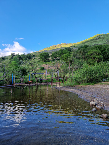 Etter en god pause var det bare å komme i gang igjen, og vi visste at det var nå den tøffeste delen av etappen kom. Og det stemte det, nå var det virkelig teknisk krevende å gå, men igjen bare moro. Dessverre fikk jeg jo ikke tatt noen bilder som virkelig viser hvordan det var. Til slutt åpnet landskapet seg igjen da vi kom til Doune Byre Bothy (en åpen "hytte" man kan sove i), flotte fjellsider med Bluebells igjen og til slutt fant vi oss en plass til å slå opp teltet rett ved ferjeleiet i Ardleish. Ferjen er en liten båt som kommer på signal (en ballong man heiser opp) på ettermiddagene og som har noen faste avganger på dagtid. Vi surret rundt en stund før vi endte opp her på stranden for plassene jeg hadde sett meg ut på forhånd var tatt. Det ble værskifte og plutselig skinte solen igjen og vannet ble blikkstille. Snakk om flott kveld etter en lang dag/treningsøkt. Det var godt å kjøle ned slitne føtter i et iskaldt vann.